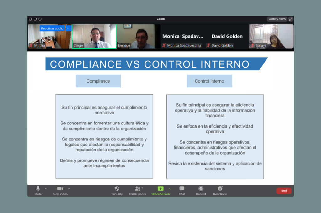 Durante la exposición se desarrollaron los lineamientos generales del cumplimiento normativo, los riesgos de incumplimiento, los roles dentro de la organización, así como cuestiones particulares relacionadas con los errores habituales y la diferencia entre Compliance y Control Interno.