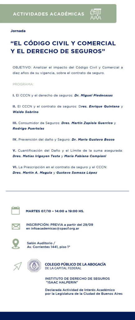 El Colegio Público de la Abogacía de la Capital Federal invita a participar de la Jornada Académica sobre “El Código Civil y Comercial y el Derecho de Seguros”, que se llevará a cabo el próximo martes 7 de octubre de 2025, de 14:00 a 19:00 horas.